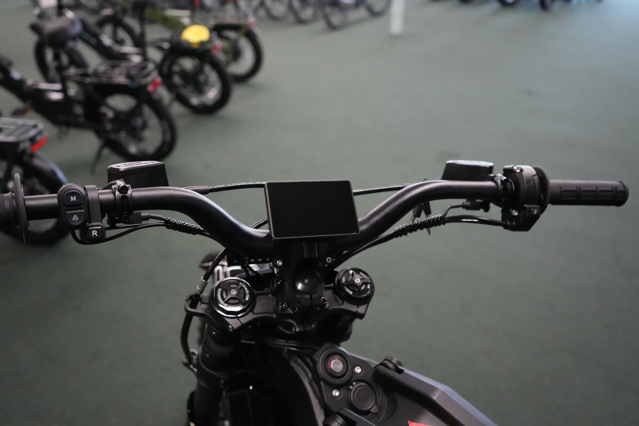 | Brake Type | Adjustable levers, 4-piston calipers, DOT fluid, and thick 220mm x 3mm rotors. |